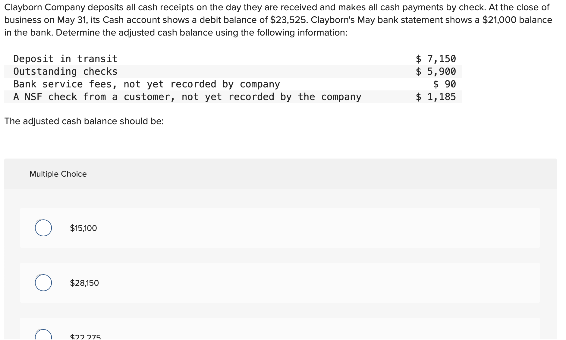 Clayborn company deposits all cash receipts on the day they are received and makes all cash payments by check. At the close of business on. At the close of business on. At the close of business on. Clayborn company deposits all cash receipts on the day they are received and makes all cash payments by check.