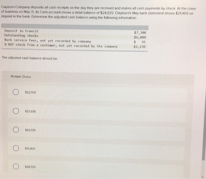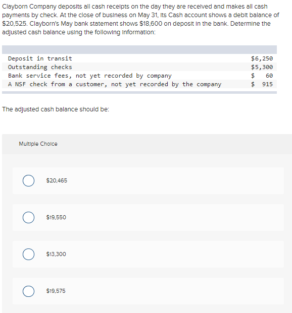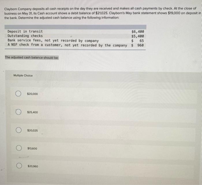 At the close of business on. Clayborn company deposits all cash receipts on the day they are received and makes all cash payments by check. At the close of business on. Clayborn company deposits all cash receipts on the day they are received and makes all cash payments by check.