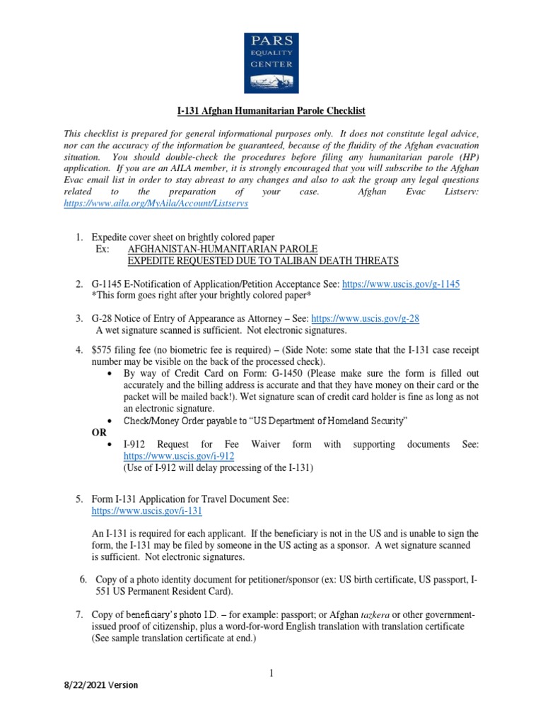 I131 Afghan Humanitarian Parole Checklist PDF Government