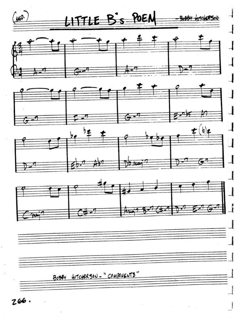 Download and print little b's poem sheet music for piano & vocal by bobby hutcherson from. Bmin7 c#min7 emin7 little b's poem bobby hutcherson arr. 6e ©2016 6e 4/16/2016 bb lead sheet. Lead sheet (singers key) little b's poem. Share, download and print free sheet music of little b's poem bobby hutcherson for piano,.