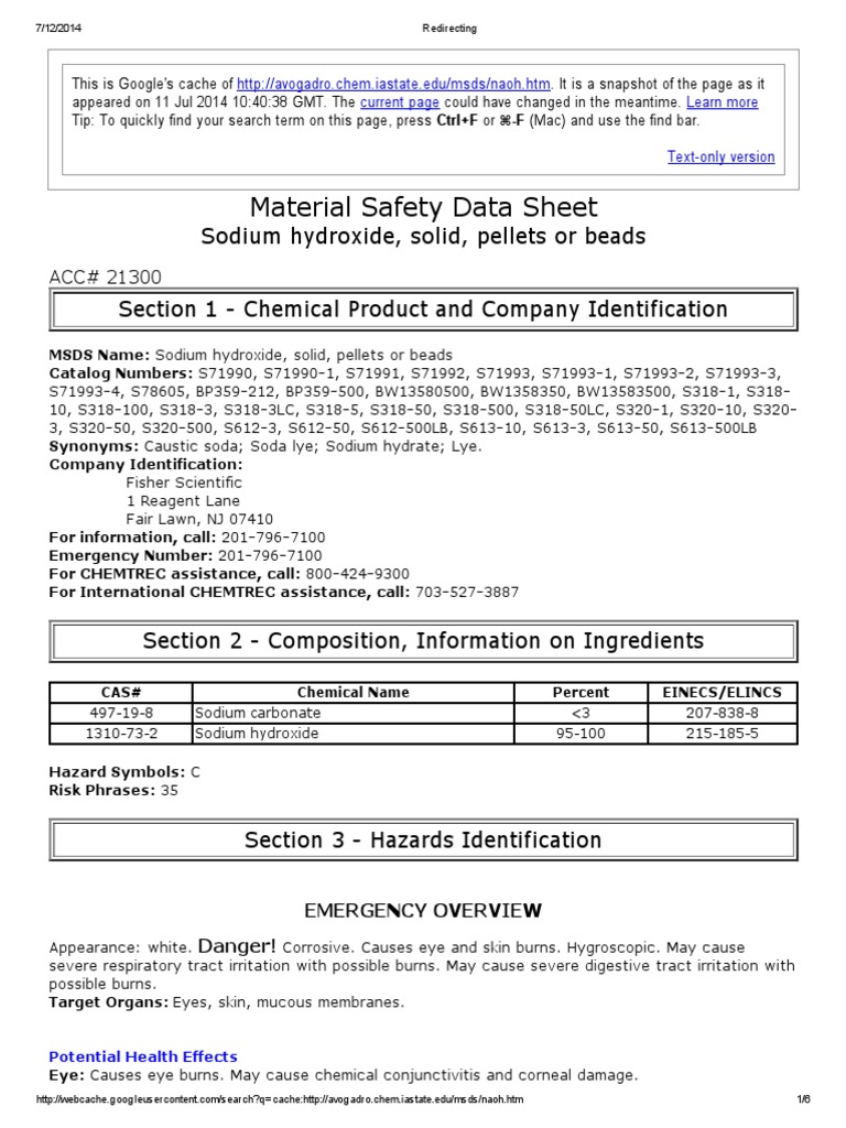 Naoh Safety Data Sheet