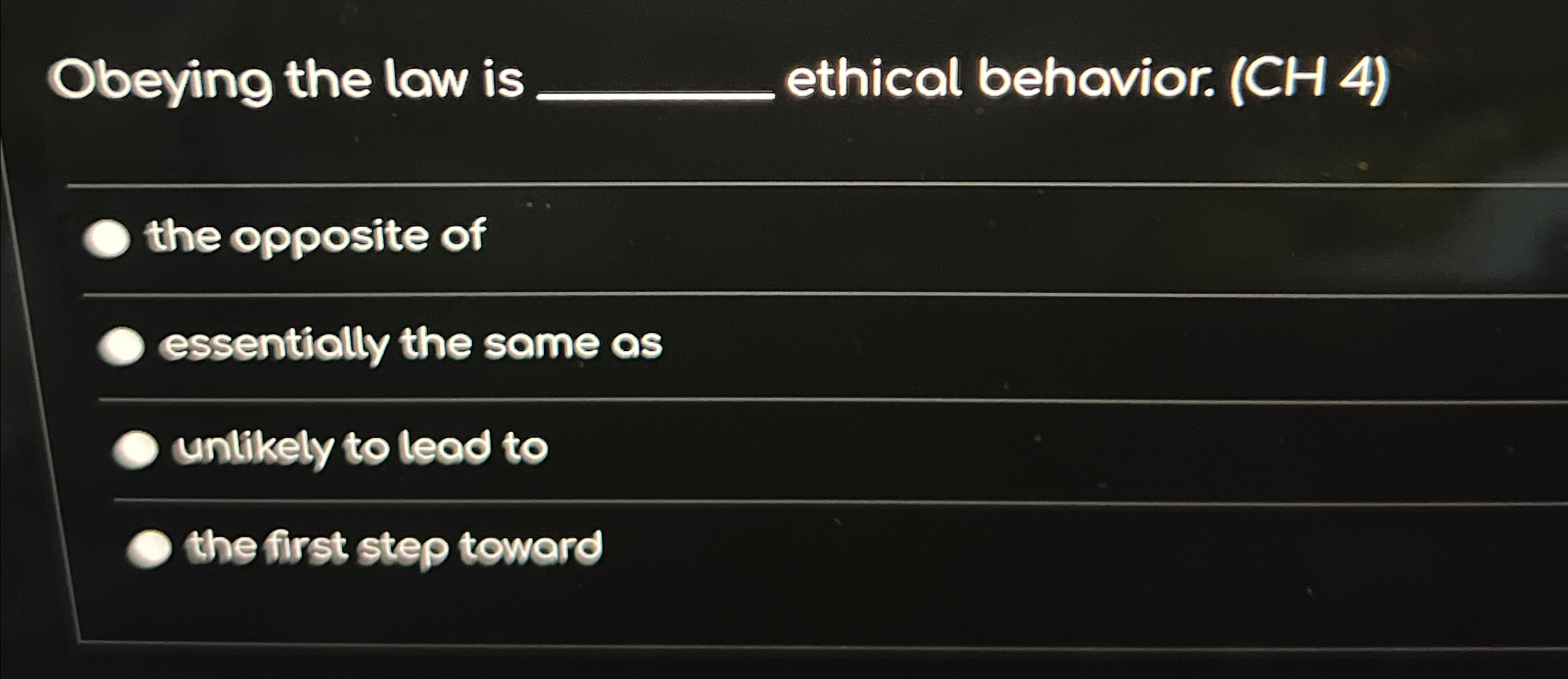 Solved Obeying the law is q, ethical behavior. (CH4)the