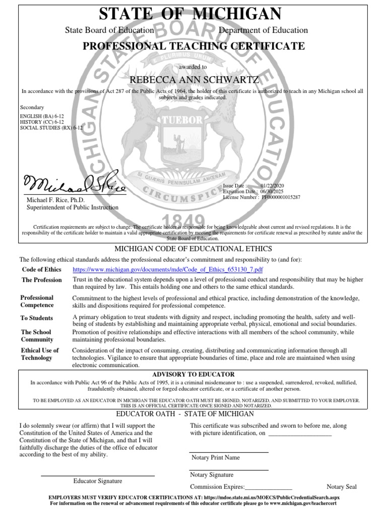 Professional Teaching Certificate Jan 2020 PDF Notary Public