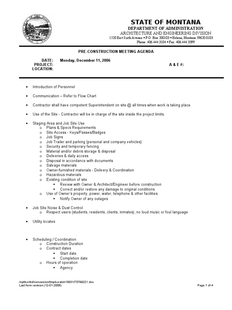Pre Construction Meeting Agenda Template - Description of project work and construction methods timelines, anticipated start work date,.