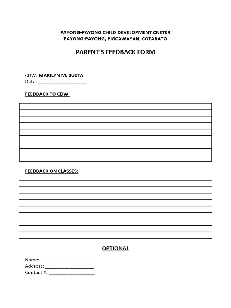 Printable Parents Feedback Form Sample - Streamline parent feedback with comprehensive forms! Collect feedback, analyze, and improve your school experience by using the parent. School feedback forms are used to gather information from students, parents, and. Parents or guardians who wish to provide feedback about their child's educational. Explore examples and create custom.