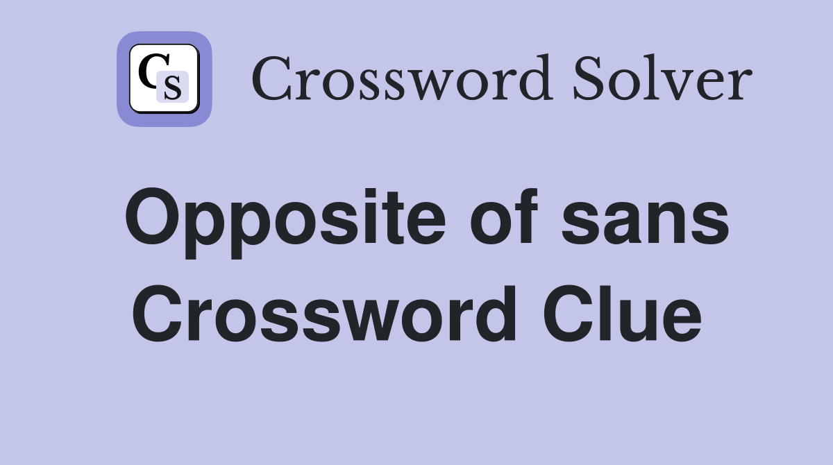 While searching our database we found 1 possible solution for the: The crossword solver found 30 answers to sans opposite, 4 letters crossword clue. Here are the possible solutions for opposite of ''sans'' clue. February 4, 2023 answer of opposite of sans clue in nyt crossword puzzle. It was last seen in daily quick.