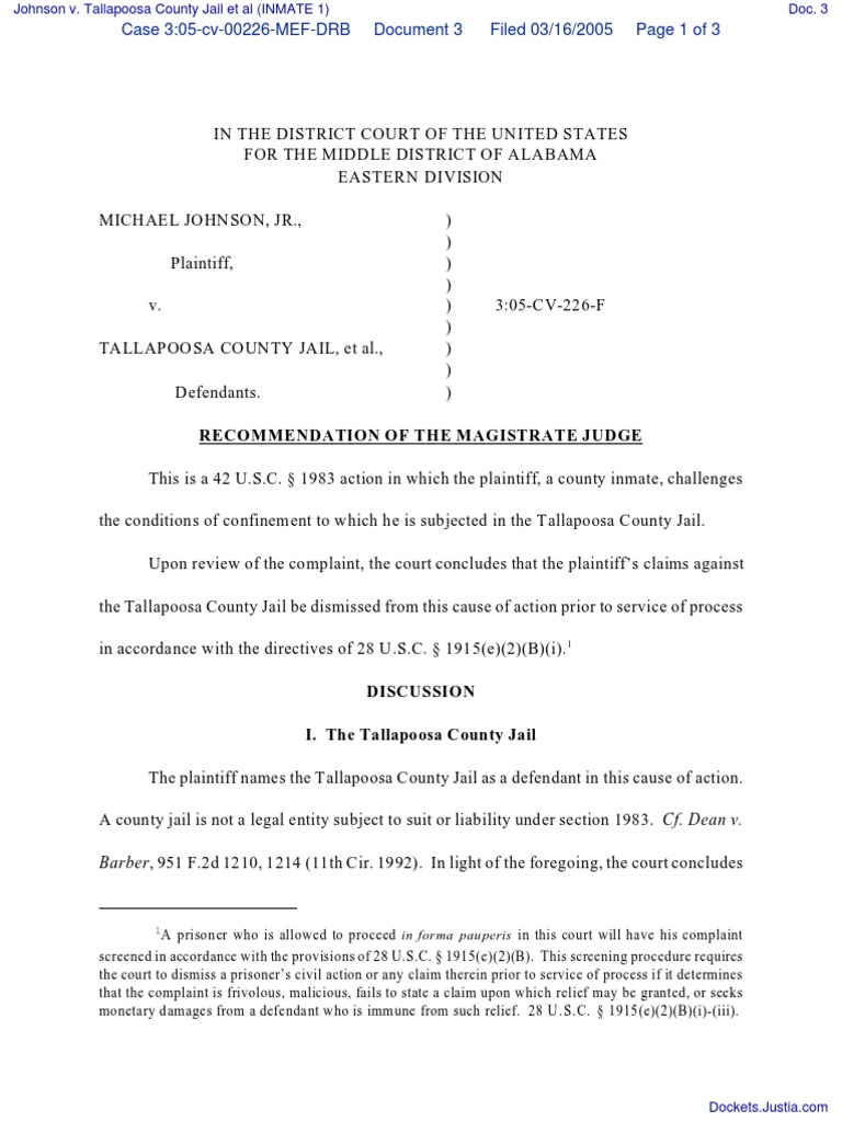 Johnson v. Tallapoosa County Jail Et Al (INMATE 1) Document No. 3