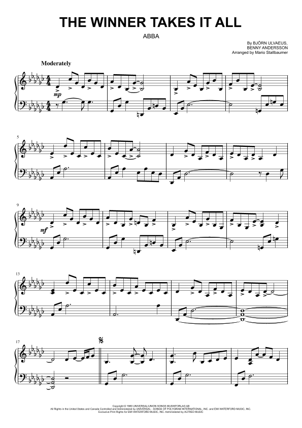 The winner takes it all sheet music by abba. Sheet music arranged for piano/vocal/guitar in. Browse our 34 arrangements of the winner takes it all. sheet music is available for piano,. Share, download and print free sheet music of the winner takes it all abba for piano, guitar, flute.