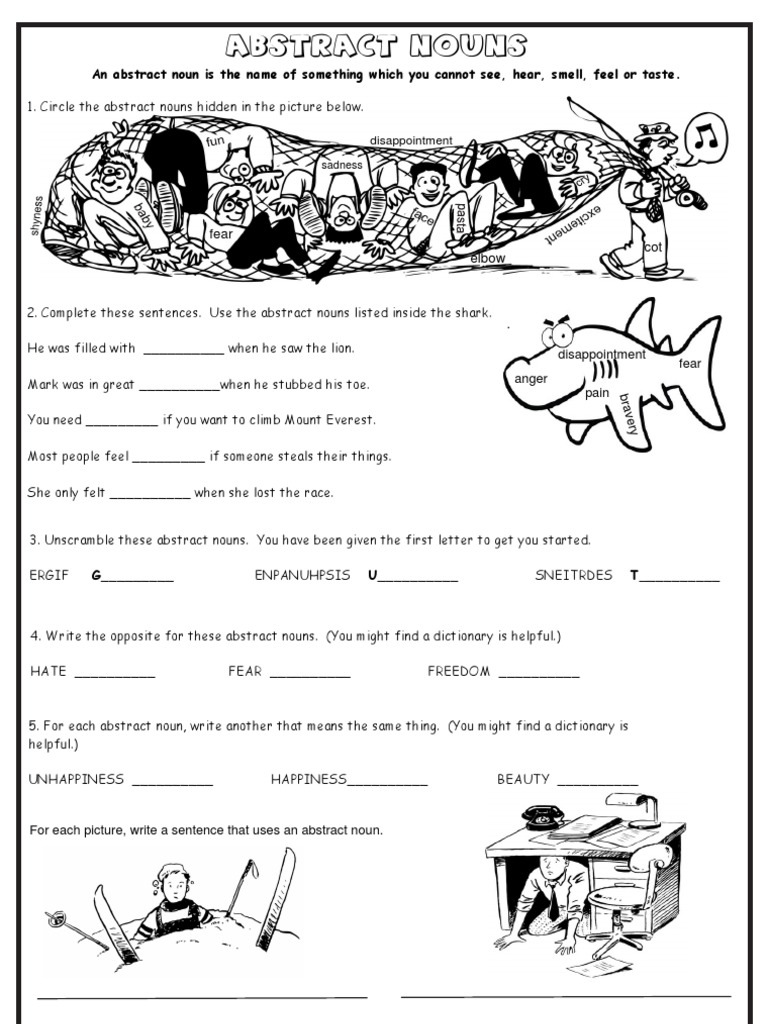 Our abstract nouns worksheets challenge students to identify abstract nouns in. A list of how to form abstract nouns from adjectives, verbs and common nouns.